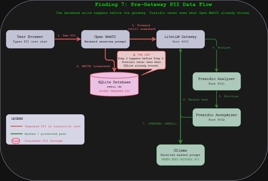 | 7 | SQLite stores unmasked prompts pre-gateway | Original PII persists in plaintext regardless of masking |