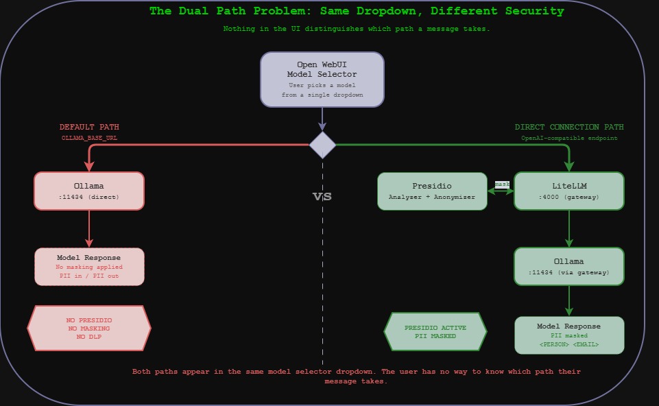 The LiteLLM models (via Direct Connections) provide the DLP-protected path. The Ollama models (via the default connection) provide the unprotected path. Both appear in the same model selector dropdown. Nothing in the UI distinguishes them. The user has no way to know which path their message takes.